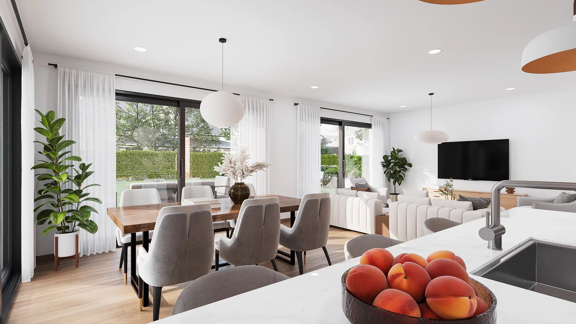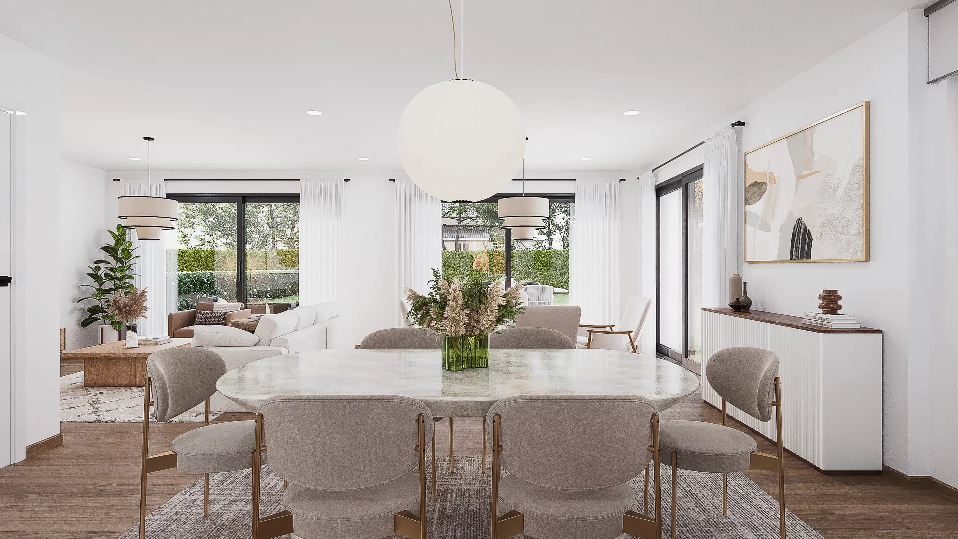 Le grand séjour avec cuisine ouverte, prolongé par une terrasse orientée plein sud et un jardin privatif de 430 m², offre un espace de vie à la fois convivial et apaisant, pensé pour la détente et le partage.
